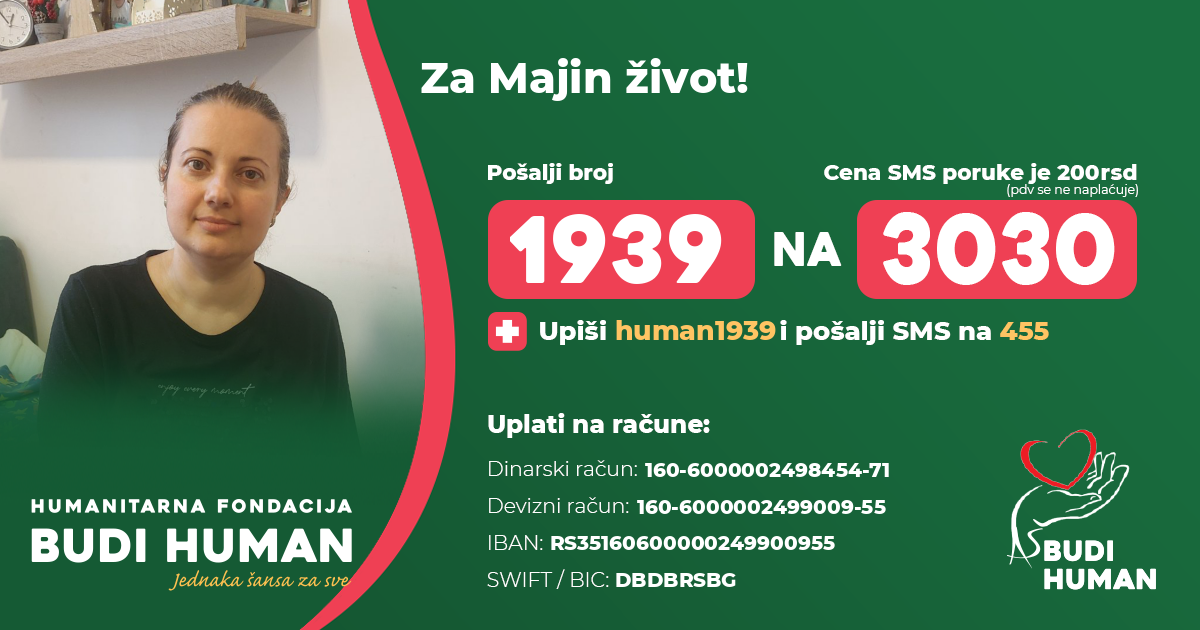 Maji možete pomoći i slanjem SMS-a 1939 na 3030 (cena je 200 dinara), a brojeve računa za veće uplate možete videti na fotografiji: