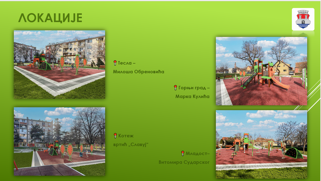 Nova igrališta biće postavljena u naselju Tesla (u Ulici Miloša Obrenovića, preko puta „BIG“ šoping centra), na Kotežu (u okviru vrtića „Slavuj“), u naselju Mladost (u Ulici Vitomira Sudarskog) i u Gornjem gradu (u Ulici Marka Kulića).