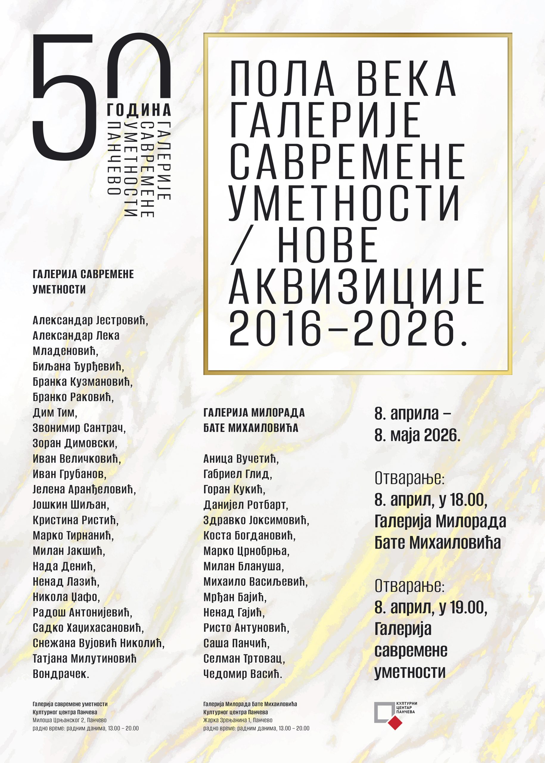 Kulturni centar Pančeva obeležiće 50 godina Galerije savremene umetnosti nizom izložbi od kojih će jedna – „Nove akvizicije 2016–2026” – biti otvorena ove srede, 8. aprila.